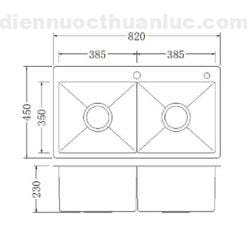 Chậu có kích thước tổng thể là 820 x 450 x 230mm, với hai hố chậu có kích thước 385 x 350 x 230mm mỗi hố. Thiết kế này giúp tạo không gian rộng rãi, dễ dàng vệ sinh và sử dụng cho nhiều loại vật dụng.